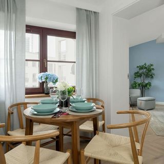 Sofa, telewizor, szafka, stolik, jadalniany stół z krzesłami