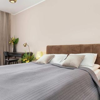 Łóżko podwójne, biurko, krzesło, lampki, szafki.