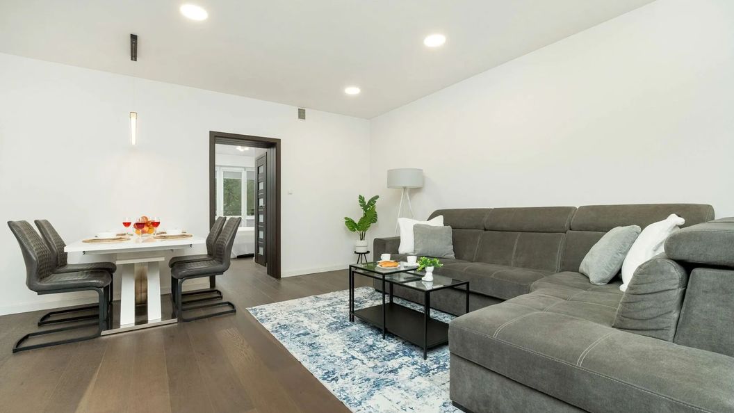Ten nowoczesny apartament ma powierzchnię 56 m² i posiada możliwość zakwaterowania 4 osób. Rozkład pomieszczeń obejmuje salon, aneks kuchenny, sypialnię, balkon oraz łazienkę z prysznicem. Wnętrze jest jasne, przestronne i funkcjonalnie zaprojektowane, wychodząc naprzeciw wszelkim potrzebom Gości. Salon to doskonałe miejsce do relaksu i spędzania czasu z najbliższymi. Miękka, szara sofa z funkcją spania zapewnia odpoczynek na wysokim poziomie. Wyjście na balkon dodaje uroku, a znajdujący się na nim stolik i krzesła zapewniają przyjemną przestrzeń do rozkoszowania się poranną kawą na świeżym powietrzu. Nowoczesny aneks kuchenny z białymi meblami wystrojem harmonijnie współgra z częścią dzienną. Wysokiej jakości sprzęty takie jak piekarnik, płyta indukcyjna, zmywarka czy kuchenka mikrofalowa pozwalają na przyrządzanie domowych potraw. Wygodny stół jadalniany z czterema krzesłami zapewnia wygodne miejsce do spożywania wspólnych posiłków. Przestronna sypialnia z telewizorem gwarantuje odpoczynek i regenerację sił na podwójnym łóżku. Garderoba z półkami oferuje przestrzeń do przechowywania osobistych przedmiotów. Nowoczesna łazienka wyposażona została w przestronną kabinę prysznicową, pralkę i suszarkę do ubrań, które zwiększają komfort każdego pobytu. Wieczorną rozrywkę zapewniają multimedia, takie jak telewizor z płaskim ekranem Smart TV i telewizją internetową, a także bezpłatny dostęp do sieci Wi-Fi. Dodatkowym atutem mieszkania jest pralka oraz suszarka do włosów, które zwiększą komfort pobytu. Na dobry początek zapewniamy Gościom bezpłatny zestaw kosmetyków, ręczniki oraz pościel.