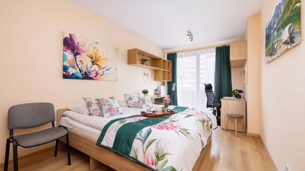 Łóżko pojedyncze, komplet pościeli, biurko, 2x krzesło, szafa, wyjście na balkon