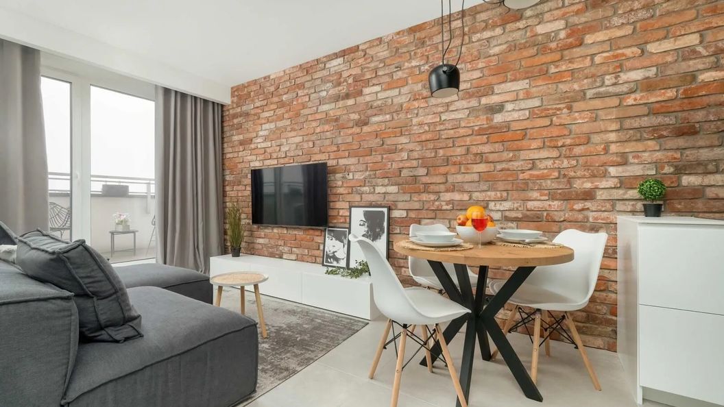 Ten luksusowy apartament znajduje się na dziewiątym piętrze i jest przeznaczony dla dwóch osób. Lokal dysponuje jedną sypialnią, w której stoi duże i wygodne łóżko dwuosobowe, a także pojemna szafa idealna do przechowywania przywiezionych ubrań czy też podręcznych drobiazgów. W klimatyzowanym salonie mieści się komfortowy, szary narożnik, a także stolik. Wieczorami można tutaj usiąść, aby zrelaksować się przy ulubionych programach telewizyjnych. W pomieszczeniu dostępny jest też jadalniany stół z krzesłami oraz funkcjonalnie wyposażony aneks kuchenny. Posiłki można przygotowywać przy użyciu takich sprzętów jak ekspres do kawy, kuchenka mikrofalowa, piekarnik czy płyta indukcyjna. Zarówno z salonu, jak i sypialni można wyjść na przestronny, umeblowany balkon. To idealne miejsce do tego, aby wypić poranną kawę z widokiem na okolicę. W łazience na gości czeka powitalny zestaw kosmetyków z ręcznikami, suszarka do włosów, pralka i wanna, w której można zrelaksować się wieczorem po całodziennych aktywnościach. Starannie dobrane dekoracje i stonowana kolorystyka wnętrza sprawiają, że apartament jest stylowy i elegancki, a jednocześnie komfortowy w użytkowaniu. Dominują tutaj odcienie bieli i szarości. O urozmaicenie aranżacji dbają drewniane akcenty oraz motyw cegły.