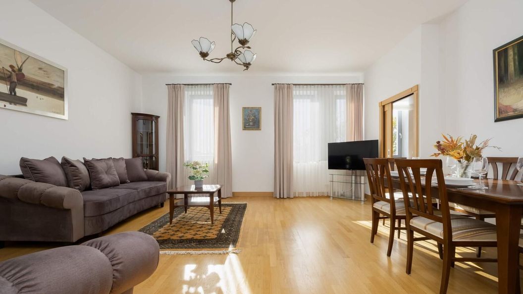 Ten komfortowy apartament może ugościć aż do 8 osób - jest to świetny wybór na rodzinny wyjazd lub dla grupy przyjaciół. Wysoce funkcjonalna przestrzeń o powierzchni 118 m² składa się z salonu z częścią jadalnianą, aneksu kuchennego, dwóch sypialni, garderoby, pralni oraz dwóch łazienek. Część dzienna wyposażona w wygodne sofy oraz telewizor Smart TV z dostępem do kanałów kablowych stanowi doskonałe miejsce odpoczynku i relaksu. Apartament posiada dostęp do szybkiego bezpłatnego Internetu Wifi. Przytulne sypialnie oferują wygodne miejsca do spania, a także biurka, dzięki czemu goście pracujący zdalnie będą mogli w komfortowy sposób zadbać o obowiązki służbowe. W pełni wyposażony aneks kuchenny, dzięki któremu przygotowanie ulubionych posiłków będzie czystą przyjemnością. Szeroki wachlarz udogodnień oraz kompleksowe wyposażenie apartamentu w niezbędne akcesoria i sprzęty kuchenne, jak i łazienkowe gwarantuje komfort pobytu. Dla ułatwienia rozpoczęcia każdej wizyty zapewniono bezpłatny zestaw kosmetyków (mydło, szampon i żel pod prysznic), ręczniki oraz pościel. Dwie osobne łazienki z toaletą zapewniają prywatność i jeszcze większy komfort. Wanna sprzyja relaksowi, co jest idealne po długim dniu, a prysznic pozwala na szybkie odświeżenie. Na wyposażeniu mieszkania goście znajdą również pralkę, co z pewnością docenią rodziny z małymi dziećmi czy osoby planujące dłuższy pobyt. Apartament wyróżnia się starannym wykończeniem oraz przytulnym klimatem. Wnętrze jest jasne, przestronne i funkcjonalnie zaprojektowane, wychodząc naprzeciw wszelkim potrzebom gości.