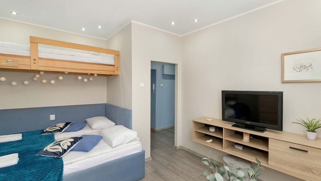 Przytulne studio o powierzchni 30 m² może ugościć 3 osoby. Jest to idealne miejsce na pobyt w Gdyni, które zapewnia wszystkie niezbędne udogodnienia. Obiekt wyróżnia się nowoczesnym wystrojem wnętrz, estetyką oraz funkcjonalnością. Jasny i przestronny salon, w którym znajduje się telewizor z płaskim ekranem, stolika kawowy, szafa oraz komoda. Jest tu komfortowe łóżko małżeńskie i pojedyncze łóżko piętrowe. Kuchnia została w pełni wyposażony we wszystkie niezbędne przybory do gotowania. Apartament posiada dostęp do szybkiego, bezpłatnego Internetu Wifi. Szeroki wachlarz udogodnień gwarantuje najwyższy komfort pobytu naszych Gości. Dla ułatwienia rozpoczęcia każdego pobytu zapewniony jest bezpłatny zestaw kosmetyków, ręczniki oraz pościel.