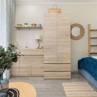 Łóżko małżeńskie, pojedyncze łóżko piętrowe, stolik kawowy, lampa, telewizor, komoda, szafa