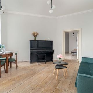 Sofa podwójna rozkładana, stolik kawowy, pianino, stół z krzesłami.