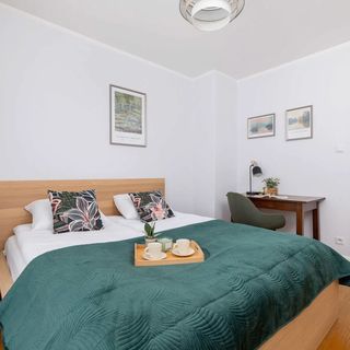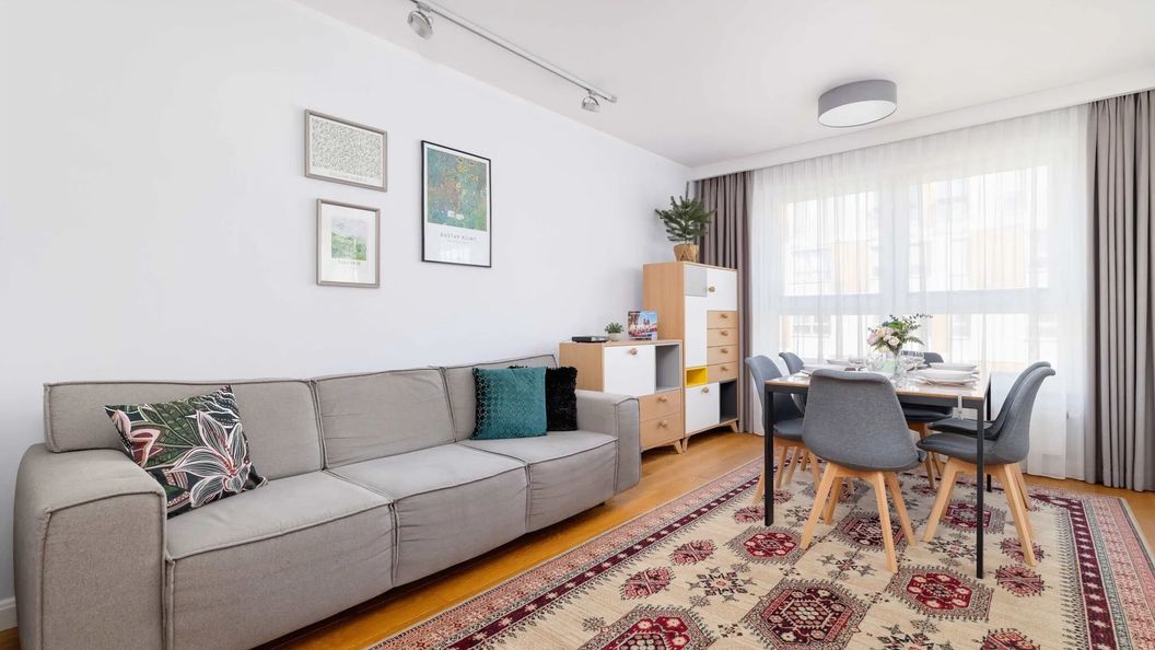 Ten stylowy i klimatyczny apartament został urządzony z dbałością o komfort użytkowania i przytulną atmosferę. Jest to doskonałe miejsce do wypoczynku dla rodziców podróżujących z pociechami, grup przyjaciół, a także uczestników wyjazdów biznesowych. Przestronny lokal znajduje się na trzecim piętrze budynku i jest przeznaczony dla sześciu osób. Apartament dysponuje dwiema sypialniami – w jednej z nich znajduje się duże i wygodne dwuosobowe łóżko, szafka idealna na podręczne drobiazgi oraz biurko z krzesłem, podczas gdy drugie pomieszczenie zostało wyposażone w dwa łóżka pojedyncze i pojemną szafę do przechowywania przywiezionych rzeczy. W salonie goście mają do dyspozycji jasnoszarą, rozkładaną sofę dwuosobową, jadalniany stół z krzesłami tapicerowanymi, szafki i telewizor z dostępem do kanałów kablowych, przy których można relaksować się wieczorami. Posiłki i przekąski można szybko i wygodnie przygotowywać w funkcjonalnie urządzonym aneksie kuchennym z takimi sprzętami jak toster, kapsułkowy ekspres do kawy, płyta indukcyjna, kuchenka mikrofalowa i piekarnik. W łazience na odwiedzających czeka powitalny zestaw kosmetyków wraz z pralką, ręcznikami, wanną i suszarką do włosów. W lokalu dostępny jest również przenośny wentylator. W wystroju wnętrza dominują jasne odcienie takie jak biel i beż, a o urozmaicenie aranżacji dbają wyraziste akcenty drewniane, motyw cegły oraz ciemne odcienie zieleni i niebieskiego. Ci, którzy chcą relaksować się na powietrzu, mogą jeść przekąski lub pić poranną kawę na dwóch umeblowanych balkonach.