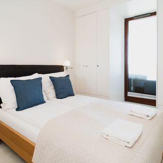 Wnętrze apartamentu to połączenie nowoczesnego designu z ciepłymi, naturalnymi akcentami. Przestronny salon z wygodną sofą, designerskimi meblami i subtelnymi elementami drewna zapewnia komfort i relaks. W sypialni króluje minimalistyczna elegancja – białe ściany, wysokiej jakości pościel, tkaniny i głębokie odcienie niebieskiego tworzą kojącą atmosferę. Apartament wyposażony jest również w przestronną szafę i duże lustro, a całość dopełniają stylowe detale oświetleniowe. Goście mają dostęp do prywatnego miejsca parkingowego w hali garażowej, co w ścisłym centrum Gdyni jest nieocenionym udogodnieniem.