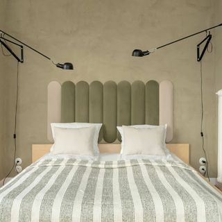 Łóżko podwójne, lampki nocne, szafka.