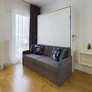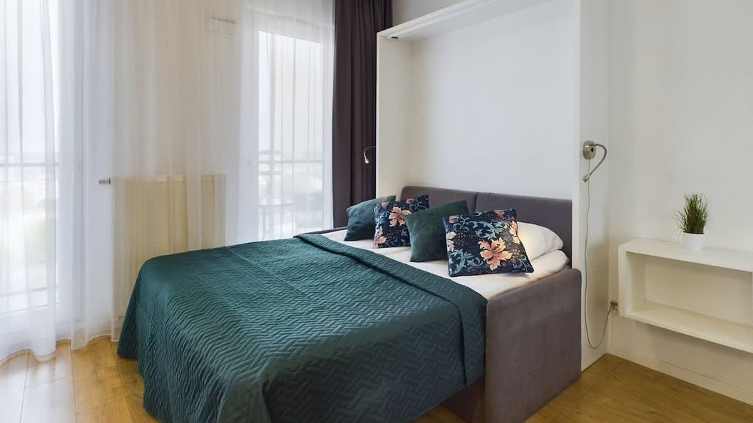 To klimatyzowane studio znajduje się na dziewiątym piętrze budynku i dysponuje umeblowanym, oszklonym balkonem, dzięki czemu goście mogą podziwiać ładny widok na miejski krajobraz, pijąc poranną kawę lub jedząc przekąski. W części mieszkalnej tego dwuosobowego lokalu znajduje się stylowa sofa, którą można rozłożyć, tworząc dużą przestrzeń do spania. Studio ma do zaoferowania również dużą i pojemną szafę przesuwną z lustrem, która jest idealna do przechowywania przywiezionych rzeczy. W pomieszczeniu stoi też jadalniany stół z krzesłami. Wieczorami odwiedzający mogą się relaksować przy ulubionych programach, oglądając telewizję kablową. Część kuchenna umożliwia szybkie i wygodne przygotowywanie posiłków. Do dyspozycji gości jest tutaj między innymi kuchenka mikrofalowa, podblatowa lodówka z zamrażarką, czajnik elektryczny i zmywarka. W łazience na odwiedzających czeka powitalny zestaw kosmetyków wraz z ręcznikami, suszarką do włosów i prysznicem. Klimatyzacja dba o to, aby goście czuli się komfortowo. Przy budynku znajdują się stojaki na rowery, a zmotoryzowani mogą znaleźć w okolicy płatne miejsca postojowe. Przytulny, a jednocześnie elegancki wystrój, utrzymany jest w stonowanej, tradycyjnej kolorystyce. Dominują tutaj odcienie szarości, drewniane akcenty oraz biel.