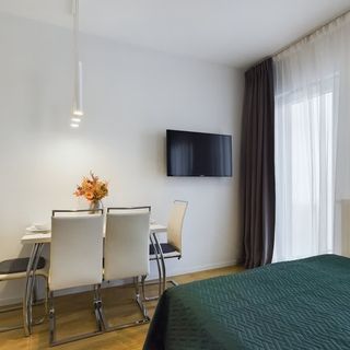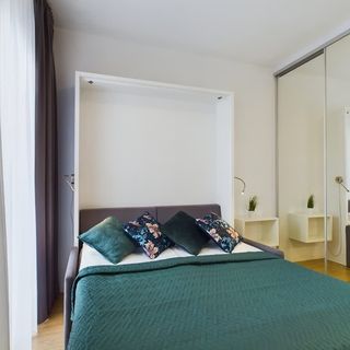 Ten nowoczesny budynek znajduje się w doskonałej lokalizacji, dzięki czemu jest to wspaniałe miejsce dla tych, którzy cenią aktywny wypoczynek i liczne atrakcje turystyczne. To świetny wybór dla osób chcących zwiedzać stolicę. Przyjechać mogą tutaj zarówno pary, jak i rodzice z dzieckiem. Cztery pobliskie sklepy spożywcze usytuowane są w odległości zaledwie minutowego spaceru, co zapewnia możliwość wygodnego zaopatrywania się z niezbędne produkty. W okolicy nie brakuje również restauracji i kawiarni – już w 1-4 minuty można dojść do siedmiu najbliższych lokali gastronomicznych serwujących kawę, słodkości, a także potrawy z rozmaitych miejsc świata. Miłośnikom zieleni wystarczy siedmiominutowy spacer, aby dotrzeć do parku z urokliwym stawem, siłownią plenerową, malowniczymi fontannami, terenami rekreacyjnymi z miejscem do jazdy na wrotkach, boiskiem do siatkówki i koszykówki, a także przestrzeniami do zabawy dla dzieci. Lokalizacja jest doskonale skomunikowana z pozostałymi częściami miasta. Nie brakuje tutaj przystanków transportu publicznego. W około 20 minut można dojść do stacji metra lub dojechać na lotnisko, a 8 minut zajmuje spacer na stację kolejową. Trasa samochodowa do centrum handlowego, na kręgielnię, do muzeum, do parku wodnego oraz na kort tenisowy trwa 5-7 minut, a na rynek niecały kwadrans, co sprzyja aktywnemu spędzaniu czasu wolnego.