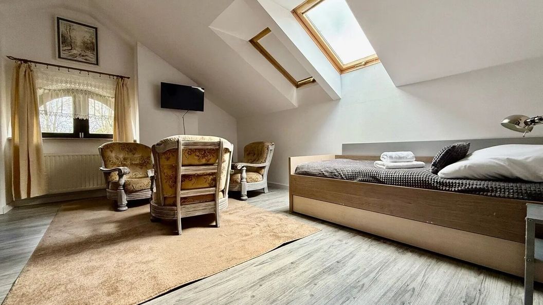 Każdy pokój został urządzony z dbałością o detale, a nasi Goście mogą liczyć na świeżą pościel, ręczniki, szybkie Wi-Fi. W pokoju znajduje się telewizor, wygodne łóżko, aby po aktywnym dniu wypocząć jak należy oraz pojemne szafy na Twój bagaż.