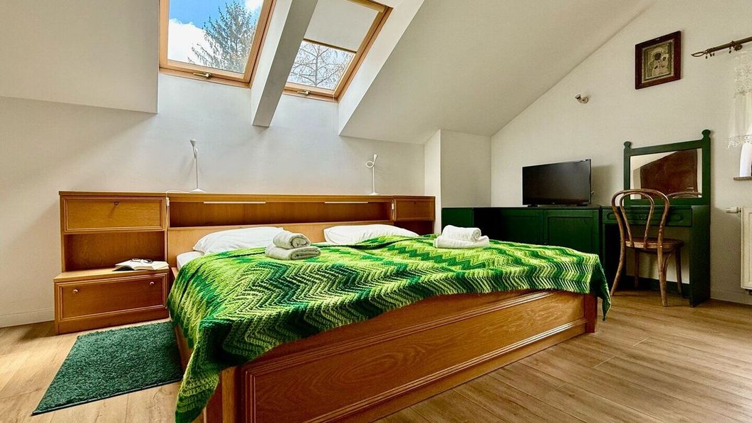 Każdy pokój został urządzony z dbałością o detale, a nasi Goście mogą liczyć na świeżą pościel, ręczniki, szybkie Wi-Fi. W pokoju znajduje się telewizor, wygodne łóżko, aby po aktywnym dniu wypocząć jak należy oraz pojemne szafy na Twój bagaż.