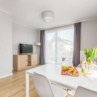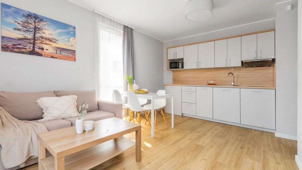 Klasyczny układ apartamentu z jedną sypialnią umożliwia wypoczynek dla 4 osób. Salon wyposażony w rozkładaną sofę dwuosobową, połączony z aneksem kuchennym (lodówka, mikrofalówka, płyta grzewcza, akcesoria kuchenne). Sypialnia oferuje łoże małżeńskie.Łazienka wyposażona w kabinę prysznicową, WC, umywalkę, suszarkę do włosów oraz pralkę. Apartament wyposażony w TV 40 cali z funkcją Smart WIFI oraz szybkie łącze internetowe.