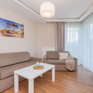 Komfortowy i przytulny apartament o powierzchni 38m2 przeznaczony jest dla maksymalnie czterech osób. Składa się z niezależnej sypialni, salonu połączonego z aneksem kuchennym, przestronnej łazienki wyposażonej w kabinę prysznicową, WC, umywalkę oraz pralkę a także tarasu od strony wschodniej. W sypialni znajduje się łoże małżeńskie, natomiast w salonie – dwuosobowa rozkładana kanapa. Do apartamentu przynależy jedno miejsce parkingowe.