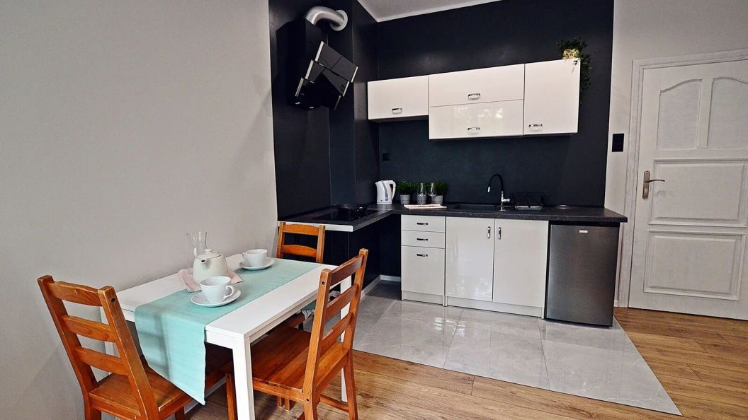 Apartament posiada aneks kuchenny wyposażony w dwupalnikową płytę indukcyjną, lodówkę oraz komplet naczyń i sztućców. W łazience do dyspozycji gości jest prysznic.