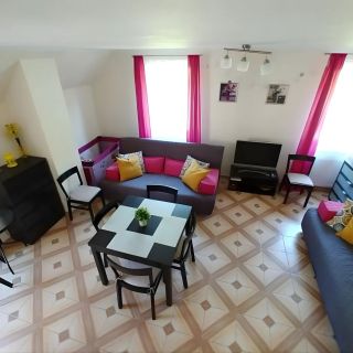 Apartament może komfortowo pomieścić do 8 osób. Składa się z przestronnego salonu z aneksem kuchennym oraz sypialni na poddaszu. W salonie znajdują się dwie rozkładane sofy, stół z krzesłami oraz telewizor. Aneks kuchenny jest w pełni wyposażony i umożliwia samodzielne przygotowywanie posiłków. Na poddaszu mieści się sypialnia z łóżkiem małżeńskim oraz dwoma łóżkami pojedynczymi.