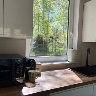 Aneks kuchenny jest wyposażony w lodówkę, płytę indukcyjną, kuchenkę mikrofalową, ekspres do kawy.
