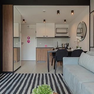 W apartamencie znajduje się doskonale wyposażony aneks kuchenny przystosowany do zaspokajania codziennych potrzeb. Do dyspozycji naszych Gości udostępniamy sprzęt AGD m.in. lodówkę, płytę grzewczą oraz komplet naczyń, sztućce, akcesoria kuchenne, szklanki i kieliszki do wina. Wszystko, co potrzebne by samodzielnie przygotować posiłki i cieszyć się wspólnymi chwilami z bliskimi.
