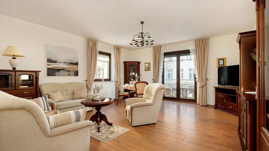 Rozkładana sofa, zestaw wypoczynkowy, komody, telewizor, stół z krzesłami, wyjście na balkon