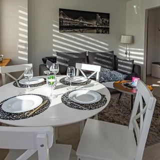 Kuchnia w apartamencie została wyposażona w sprzęty AGD umożliwiające swobodne przyrządzanie każdego posiłku: lodówka, mikrofalówka, płyta indukcyjna z okapem, czajnik elektryczny i ekspres do kawy. Naczynia obiadowe, miski, salaterki i kieliszki do wina wszystko, co potrzebne by samodzielnie przygotować posiłki i cieszyć się wspólnymi chwilami z bliskimi.