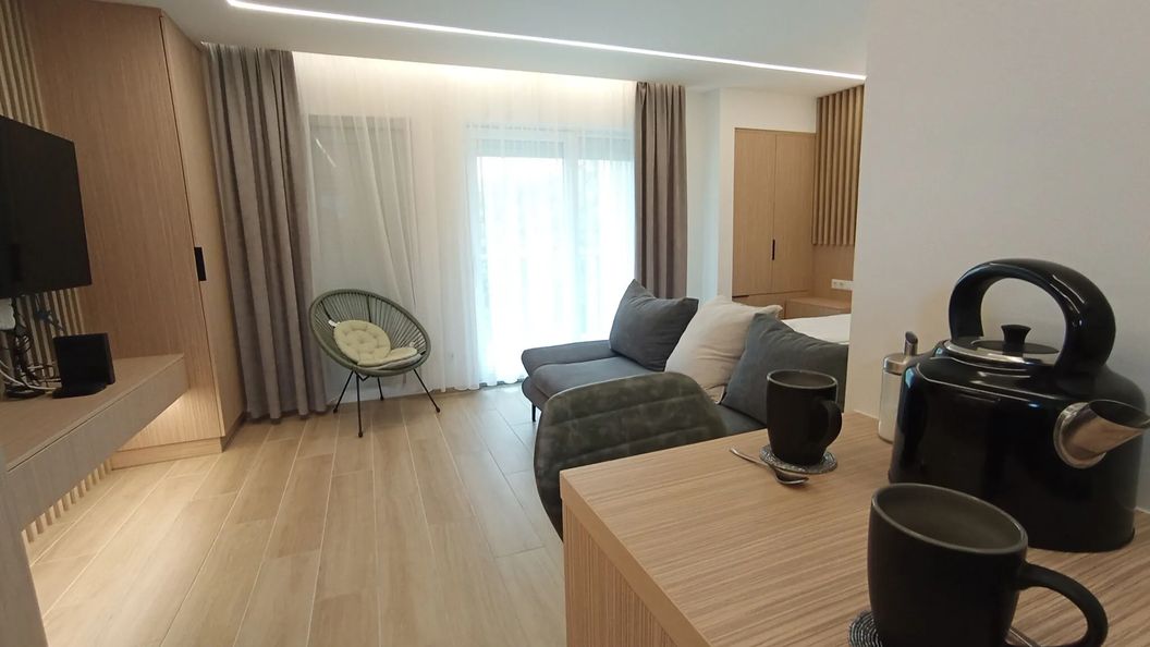 Apartament znajduje się na pierwszym piętrze budynku mieszkalnego. Jest gustownie urządzony i dobrze wyposażony, składa się z dużego pokoju z balkonem, małej kuchni oraz łazienki. To idealny wybór dla par.