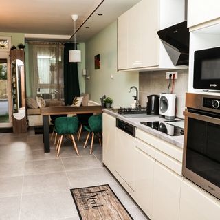 Apartamenty są w pełni wyposażone, aby umożliwić samodzielne przygotowywanie posiłków. Do dyspozycji gości jest aneks kuchenny z lodówką, płytą grzejną, kuchenką mikrofalową oraz zmywarką. Dostępne są również czajnik elektryczny i niezbędne akcesoria kuchenne. Wewnątrz znajduje się także wydzielone miejsce do pracy z laptopem oraz telewizor Smart TV.