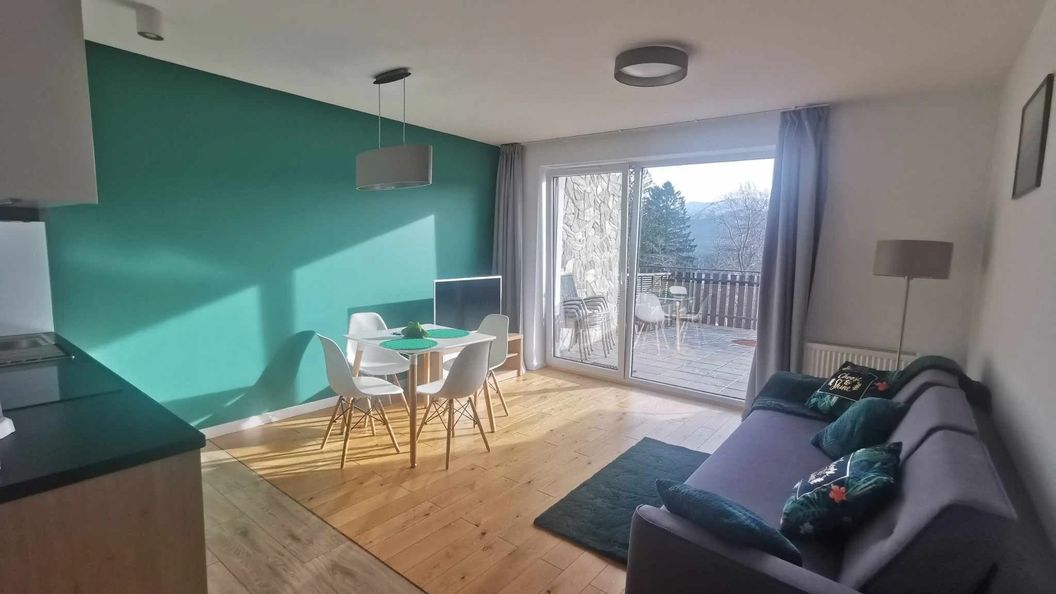 Apartament z pięknymi widokami, przestronny i komfortowy, znajduje się w cichej, spokojnej okolicy, blisko lasu. Łatwy i szybki dostęp do centrum, a także do pobliskich atrakcji turystycznych sprawia, że obiekt jest dogodnym miejscem i bazą wypadową nawet dla najbardziej wymagających gości.