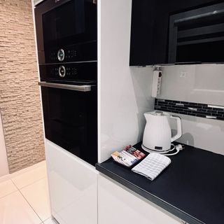 • Nowoczesna kuchnia z płytą indukcyjną, czajnikiem, lodówką, zastawą i niezbędnym wyposażeniem