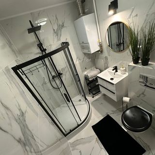 nowoczesnej łazienki z prysznicem i ręcznikami,