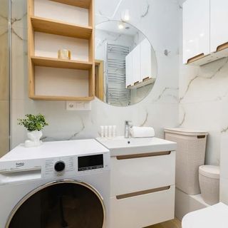 Prysznic, toaleta, umywalka, ręczniki, lustro, kosmetyki, suszarka do włosów, pralka