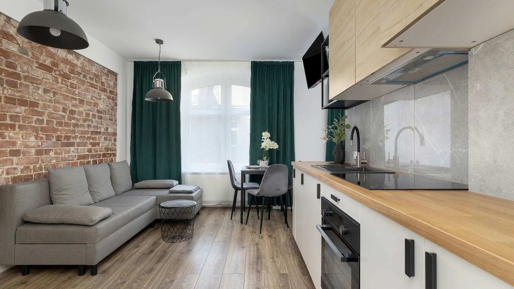 To funkcjonalne i urokliwe studio o powierzchni 28 m² jest idealne dla pary, małej rodziny lub grupy znajomych, ponieważ pomieści komfortowo do czterech osób. Wnętrze zostało zaplanowane tak, aby oddzielić część dzienną od sypialnianej, co zwiększa wygodę pobytu. W części dziennej rzuca się w oczy piękna ceglana ściana oraz zasłony w odcieniu butelkowej zieleni, które dodają wnętrzu przytulności. Znajduje się tam także rozkładana sofa dla dwóch osób oraz 40-calowy Smart TV z dostępem do telewizji internetowej, co zapewnia rozrywkę i relaks po dniu pełnym wrażeń. W wydzielonej części sypialnianej znajduje się wygodne, podwójne łóżko zapewniające spokojny sen. Studio urządzone jest w nowoczesnym, minimalistycznym stylu, a jasna kolorystyka optycznie powiększa przestrzeń. Aneks kuchenny został w pełni wyposażony – znajdują się w nim płyta grzewcza, piekarnik, lodówka z zamrażarką, czajnik elektryczny oraz pochłaniacz pary. Stół jadalniany sprzyja wspólnym posiłkom i rozmowom. Nowoczesna łazienka oferuje prysznic i suszarkę do włosów. Goście mają również dostęp do pralki umieszczonej w osobnym pomieszczeniu na wspólnym korytarzu, do którego klucz znajduje się w sejfie. Do dyspozycji są także suszarka na ubrania, odkurzacz, żelazko i deska do prasowania. W ciepłe dni ochłodę zapewnia wentylator. Zwierzęta są mile widziane za dodatkową opłatą.