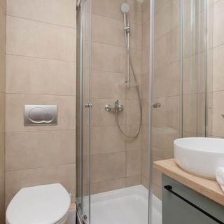 Na dobry początek wizyty przygotowano zestaw powitalny: kosmetyki (mydło, szampon, żel pod prysznic), komplet świeżych ręczników oraz pościel. Jasna łazienka została wyposażona w wygodną kabinę prysznicową, suszarkę do włosów oraz dodatkowy zestaw kosmetyków i ręczników.
