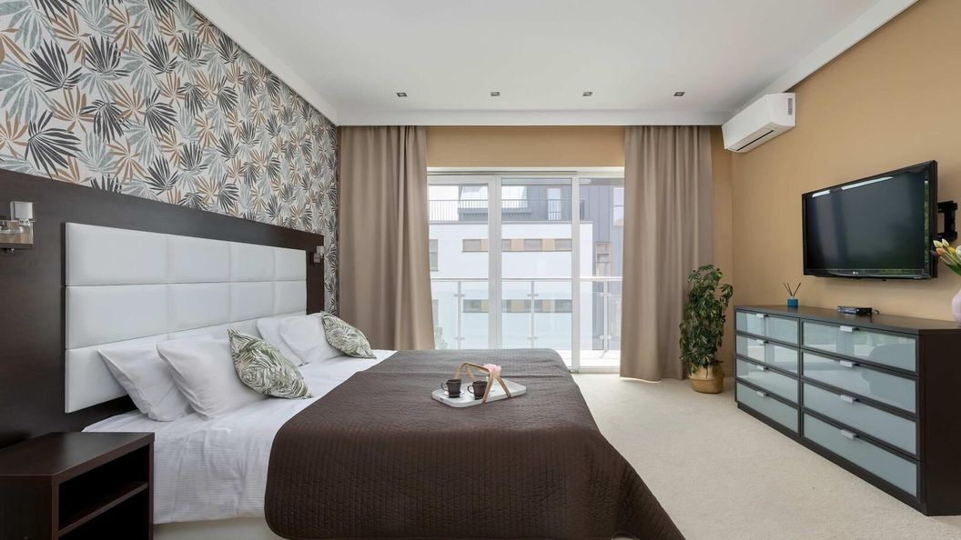 To klimatyzowane mieszkanie to idealna propozycja dla większej rodziny lub grupy przyjaciół. Oferuje komfortowy pobyt dla maksymalnie ośmiu osób i znajduje się w niewielkiej odległości od malowniczego wybrzeża Mielna. W przestronnym salonie uwagę przyciąga wzorzysta, niebieska ściana, która w połączeniu z ciemnymi meblami tworzy wyrazisty, nowoczesny kontrast. Dwie rozkładane sofy zapewniają wygodne miejsce do wypoczynku w ciągu dnia i komfortowy sen w nocy. Ciepłe oświetlenie, subtelne dekoracje i eleganckie zasłony dopełniają całości. Duży smart TV sprzyja wspólnym wieczorom filmowym po dniu pełnym nadmorskich atrakcji, a klimatyzacja zapewnia przyjemną temperaturę nawet w najcieplejsze dni. Aneks kuchenny wyposażono we wszystko, co potrzebne podczas dłuższego i krótszego pobytu. Znajduje się tu płyta indukcyjna, ekspres do kawy z młynkiem marki JURA, lodówka z zamrażarką, czajnik elektryczny, kuchenka mikrofalowa oraz opiekacz do kanapek. Tuż obok umieszczono stół jadalniany z wygodnymi krzesłami, przy którym można rozpocząć dzień filiżanką aromatycznej kawy albo zakończyć go przy domowej kolacji. Sypialnia została urządzona w ciepłych, karmelowych tonach, które tworzą przytulną i wyciszającą atmosferę. Duże łóżko małżeńskie zapewnia wygodny wypoczynek, a dodatkowa rozkładana sofa pozwala na komfortowe zakwaterowanie kolejnych dwóch osób. Ciemnobrązowe meble kontrastują z jasnym dywanem i harmonijnie wpisują się w estetykę wnętrza. Dodatkowo w pomieszczeniu znajduje się telewizor oraz klimatyzacja, która dba o komfort niezależnie od pogody. Do dyspozycji gości są dwie łazienki. Jedna z nich wyposażona jest w wannę, druga w prysznic. Obie zostały wykończone w jasnych tonacjach i wyposażone w elegancką armaturę oraz suszarkę do włosów. Zarówno z salonu, jak i z sypialni prowadzi wyjście na przestronny balkon z wygodnymi fotelami i stolikiem. To idealne miejsce na poranną kawę przy śpiewie ptaków lub kieliszek wina po zachodzie słońca. W całym mieszkaniu goście mogą korzystać z bezpłatnego, szybkiego Wi-Fi.