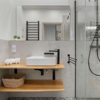 Prysznic typu walk-in, toaleta, umywalka, lustro, suszarka do włosów, ręczniki