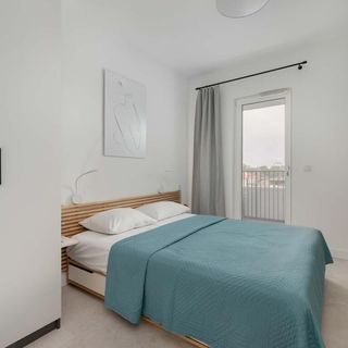 Łóżko małżeńskie, szafa, wyjście na balkon