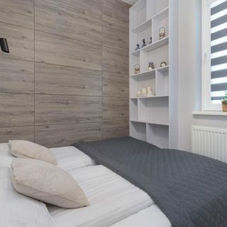 Łóżko dwuosobowe, komplet pościeli, szafa, szafka, lampki nocne