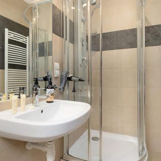 Prysznic, umywalka, lustro, wc, pralka, suszarkę do włosów.