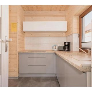 Domki posiadają na parterze salon, kuchnię w pełni wyposażoną (dodatkowo w zmywarkę) oraz łazienkę w której znalazło się też miejsce na pralkę. Natomiast piętro posiada 2 oddzielne zamykane sypialnie