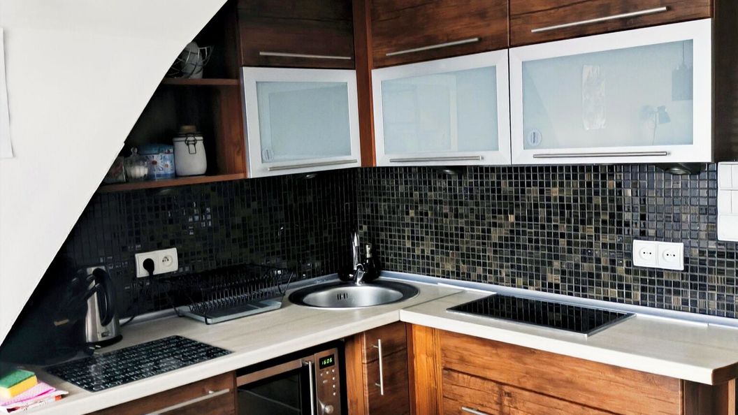 Wyposażenie apartamentu: Aneks kuchenny w pełni wyposażony: lodówka, płyta indukcyjna, mikrofalówka, zestaw garnków, naczyń i sztućców oraz zestaw do parzenia kawy i herbaty.