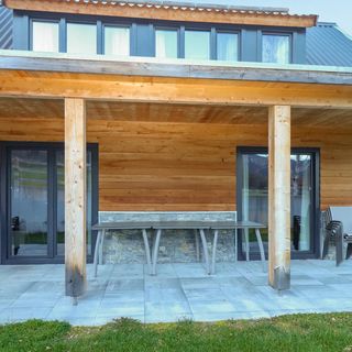 - Dom wykonany z drewna i cegły