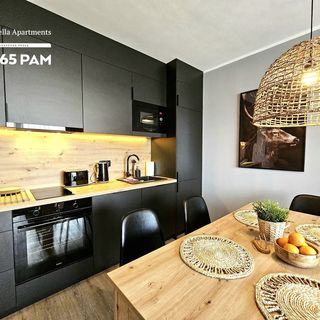 Przestrzeń dzienna jest funkcjonalnie połączona z w pełni wyposażonym aneksem kuchennym. Znajdują się w nim wszystkie niezbędne urządzenia do samodzielnego przygotowywania posiłków, w tym lodówka, płyta grzejna, piekarnik oraz zmywarka. Na wyposażeniu jest także kuchenka mikrofalowa i czajnik elektryczny.