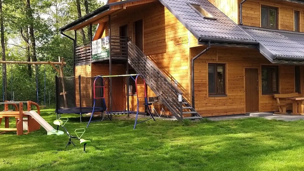 Usytuowany w cichej okolicy a jednocześnie bliskiej odległości od jeziora i centrum, około 250 metrów. Każdy apartament ma osobne wejście z dworu. Apartamenty czteroosobowe na piętrze i sześcioosobowe wyposażone są w klimatyzację. Posiadamy łóżeczko turystyczne dla dziecka. Do dyspozycji gości: parking samochodowy, grille, huśtawki, trampolina, bocianie gniazdo, zjeżdżalnia.