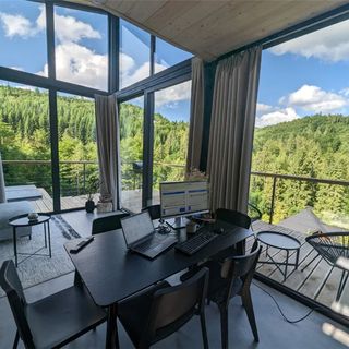 Domki Widokownia Brenna to kompleks nowoczesnych obiektów zlokalizowanych w Beskidach. Ich projekt z dużymi przeszkleniami i minimalistyczną formą został pomyślany tak, by w pełni eksponować widok na otaczające wzgórza i las.