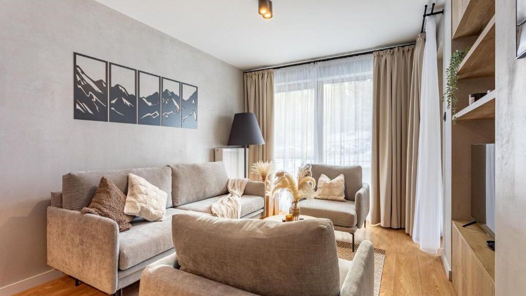 Mountain Tree Apartment to elegancki, stonowany i komfortowy apartament usytuowany na 1 piętrze, na którego powierzchnię 50 m2 składają się salon z aneksem kuchennym i balkonem, sypialnia, łazienka z toaletą.