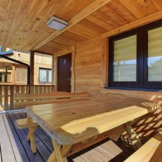 - oddzielny duży (12 mkw) zadaszony taras (stół, ławy) ,
