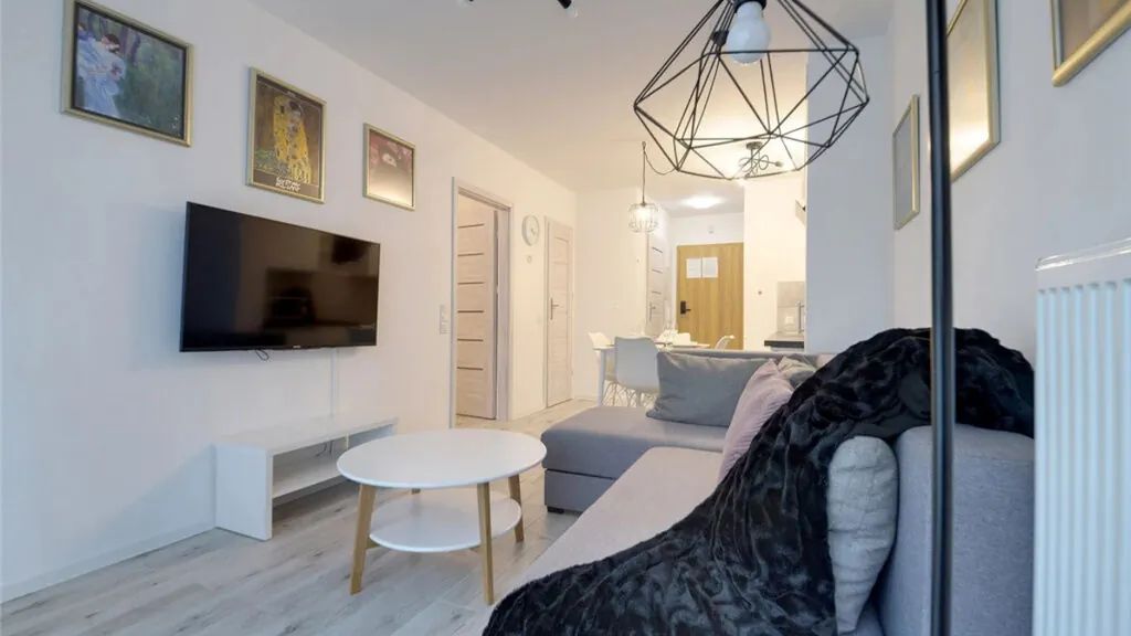 Do dyspozycji gości jest aneks kuchenny połączony z salonem, w którym znajduje się rozkładana sofa, stanowiąca dodatkowe miejscem do spania dla dwóch osób, sypialnia z łóżkiem małżeńskim, łazienka z kabiną prysznicową oraz przedpokoju i garderoba, która stanowi idealne miejsce dla bagaży, sprzętu sportowego a jednocześnie pozwala na zachowanie porządku i wygody w apartamencie. Do dyspozycji gości jest także ogród zimowy.