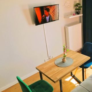 W apartamencie przygotowano w pełni funkcjonalny aneks kuchenny. Został on wyposażony w płytę grzejną, lodówkę, zmywarkę, kuchenkę mikrofalową, a także czajnik elektryczny i komplet przyborów kuchennych, co pozwala na samodzielne przygotowywanie posiłków.