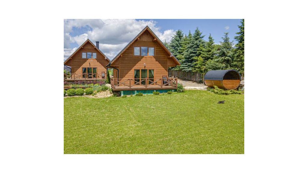 Domki drewniane wybudowane w 2020 roku, 6-7 osobowe, o powierzchni prawie 100m2 każdy.
