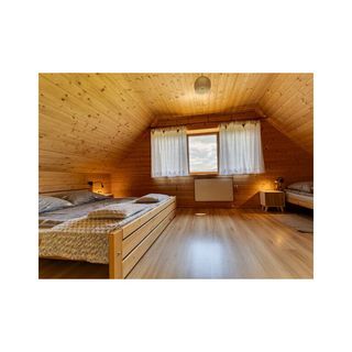 Na piętrze dwie sypialnie, każda z łóżkiem podwójnym i pojedynczym, w salonie dodatkowo rozkładana sofa.