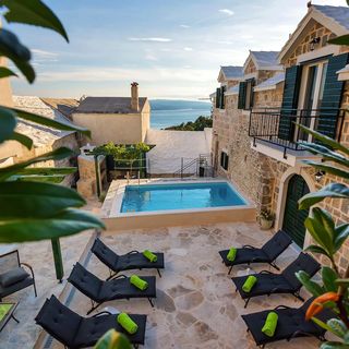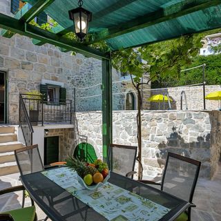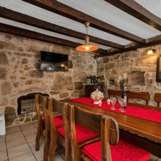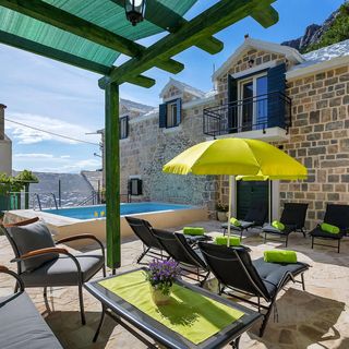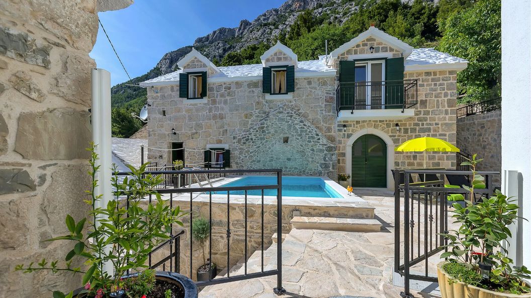 Kamienny dom gościnny położony w naturalnym otoczeniu w miejscowości Baška Voda, w regionie Dalmacji.